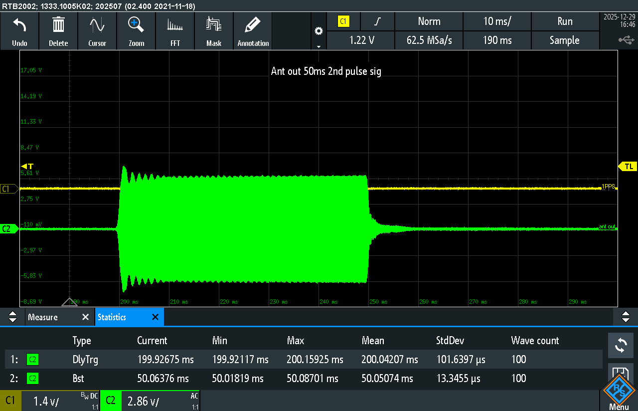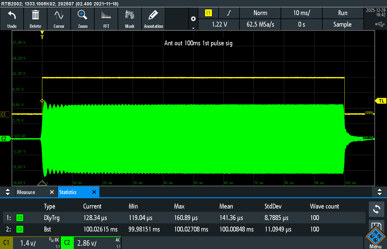 Pulse generation is performed using a Keysight EDU33211A laboratory signal generator operating in burst mode with external 1PPS synchronization.