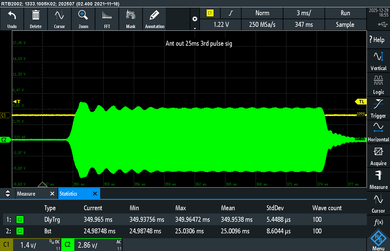 From antenna-output measurements, pulse duration variation is on the order of single-digit to tens of microseconds for pulse lengths of 25–100 ms.