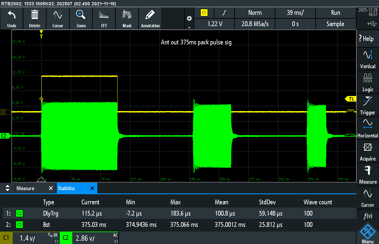 Measured pulse positions relative to the trigger confirm the packet timing: