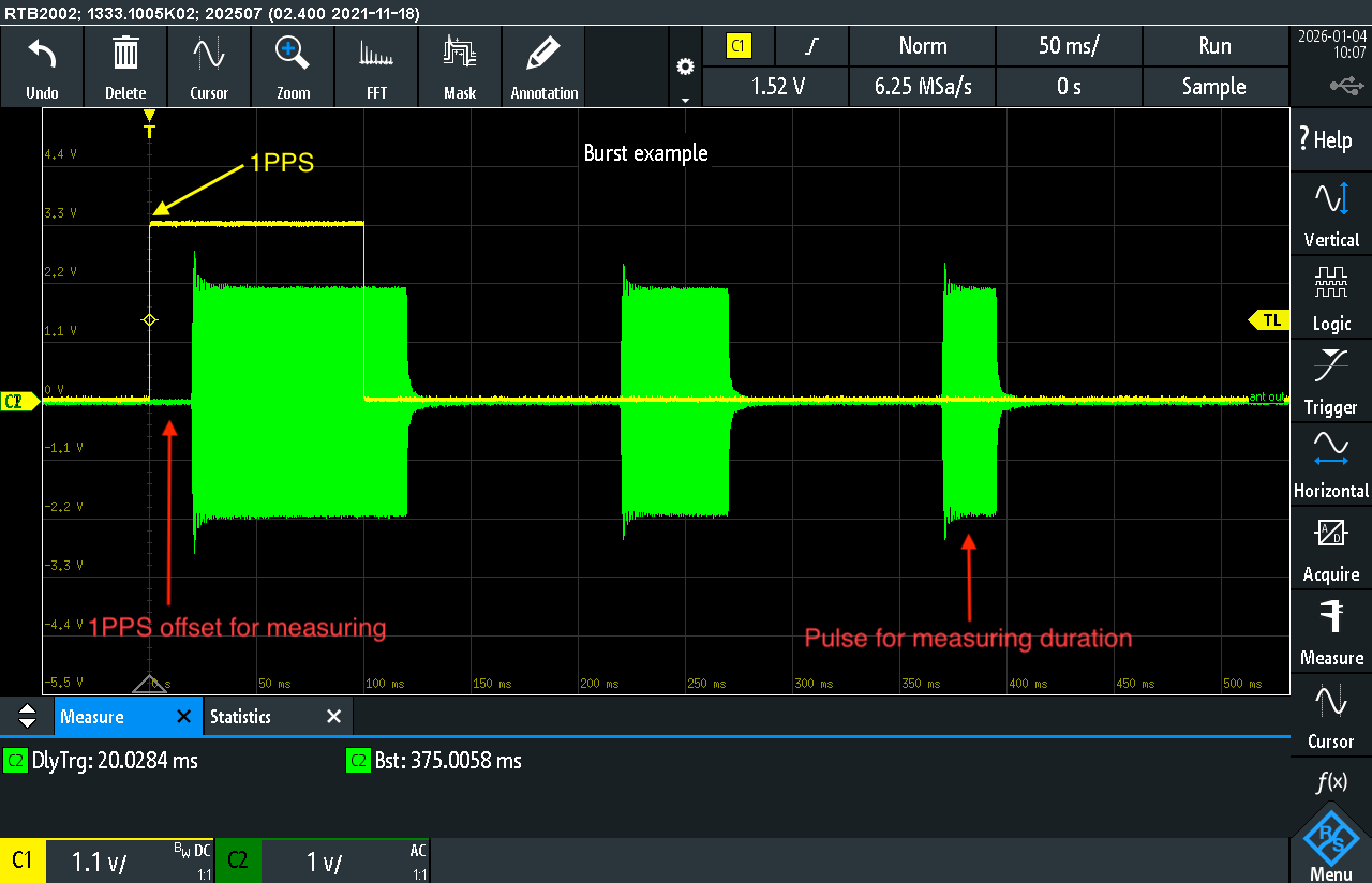 - the transmitter generates the pulse burst without any intentional offset, fully synchronized to 1PPS;